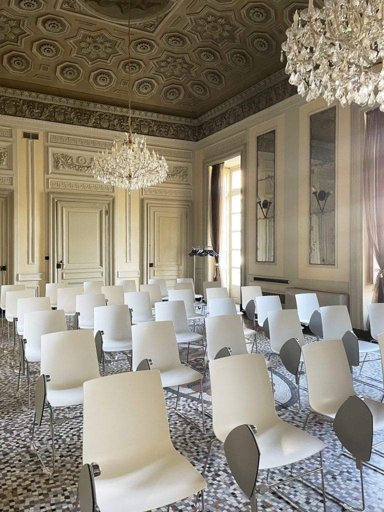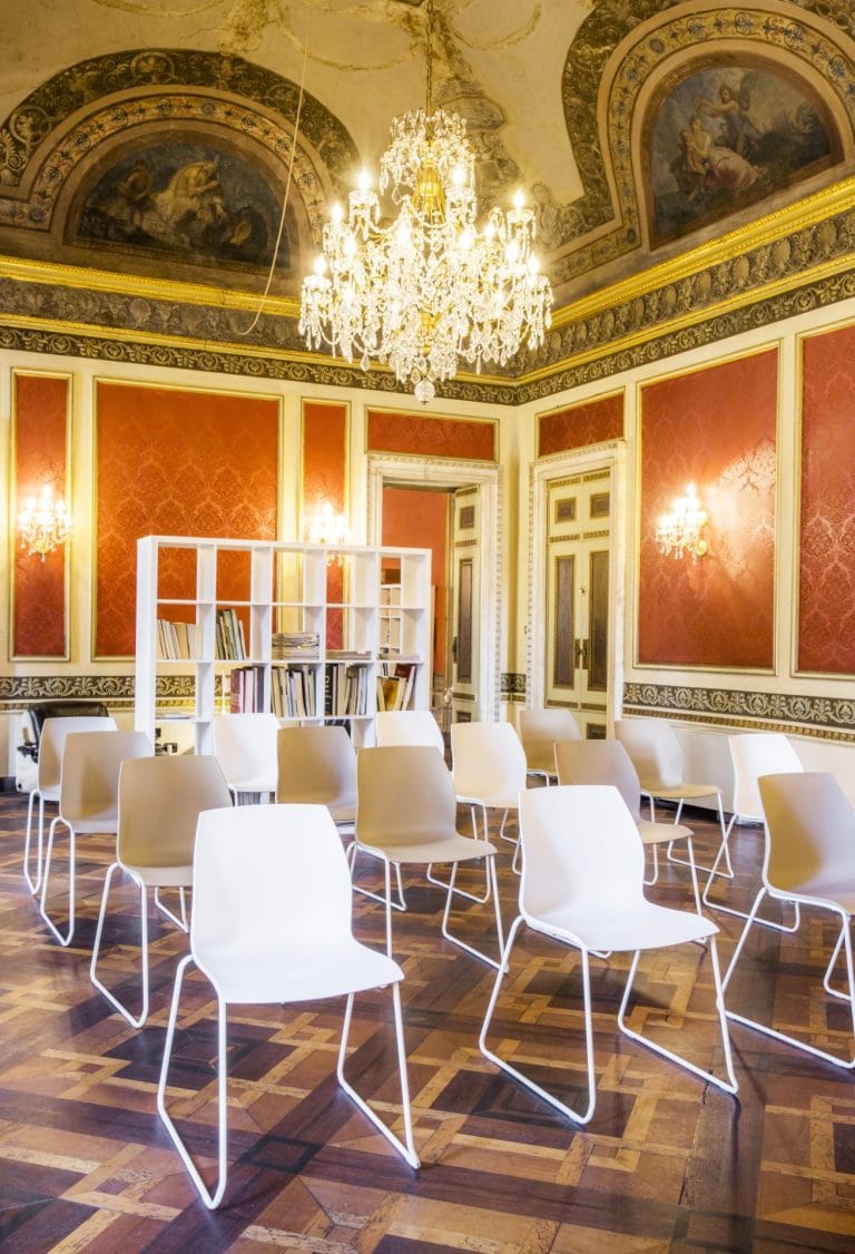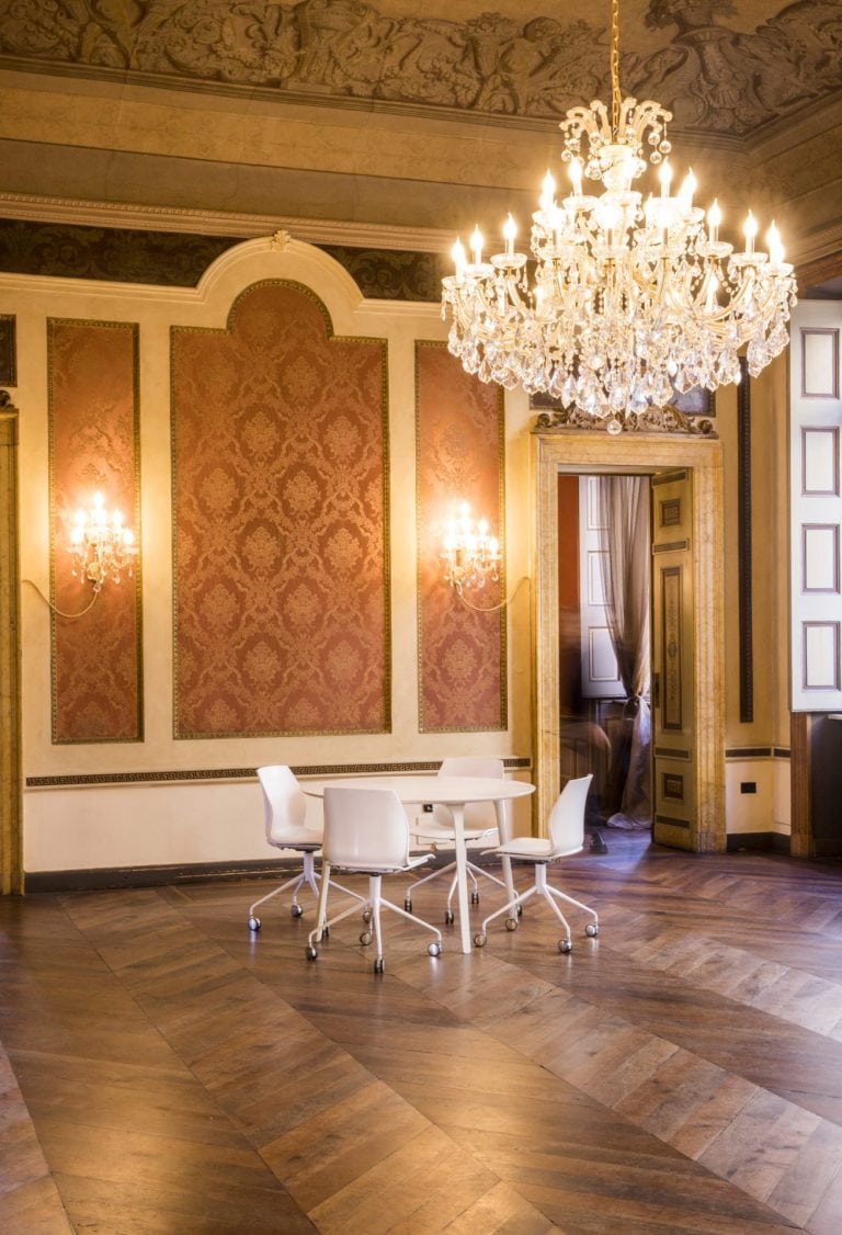 Il palazzo è di proprietà di Reale Immobili, che ha affidato a Ultraspazio la gestione di una parte delle sale del piano nobile, alcune delle quali sono state destinate alle attività formative dell’Academy di Reale Group. Da circa un mese, dopo tre anni di programmi virtuali dovuti alla pandemia, l’Academy è infatti tornata in presenza e ha trovato casa qui, dove utilizza tre sale per la formazione, tre salottini per gestire sottogruppi di lavoro, un’area break, oltre a disporre di un ampio terrazzo che si affaccia sul cortile interno.
